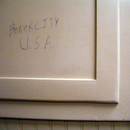 T-bag sits, he's on the computer eating oatmeal, thinking of what to do today (Foreground). The smell of burnt eggs fill the room, his GF is cooking in the background.