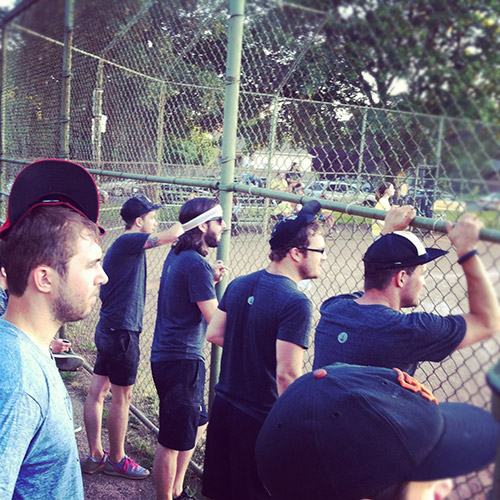 The team huddles up for the pre-game cheer. We shotgun a beer and yell as loud as we can. Someone blasts Boyz II Men from a boombox and it's game on.